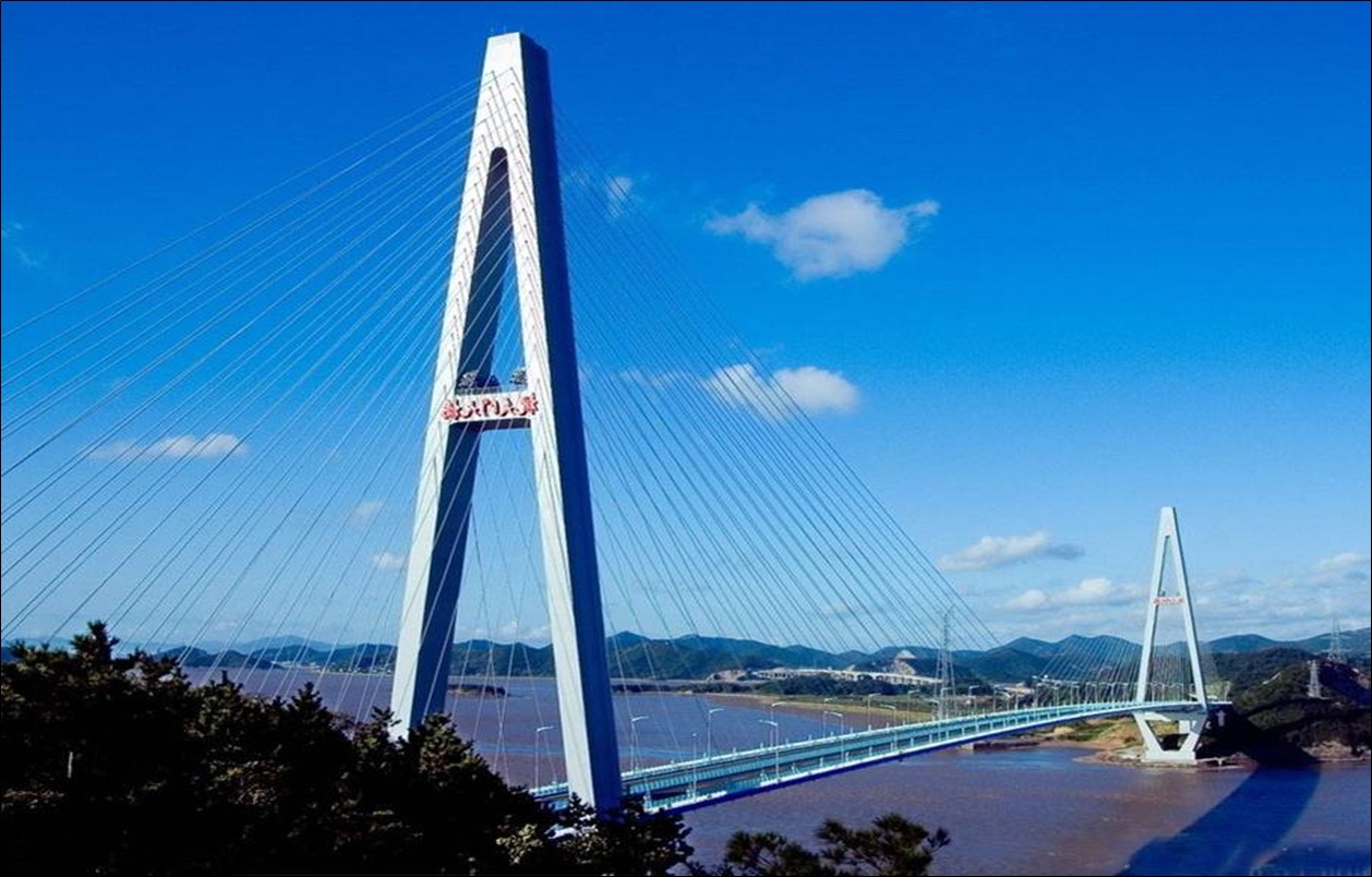 4、工程簡介:桃夭門大橋是舟山大陸連島工程的第三座跨海大橋,跨越桃夭門水道,連接富翅島和冊子島,全長888米,橋面寬27.6米,主橋為主跨580米的雙塔雙索面半漂浮體系混合式斜拉橋,橋跨布置為48米+48米+50米+580米+50米+48米+48米,主塔高151米。