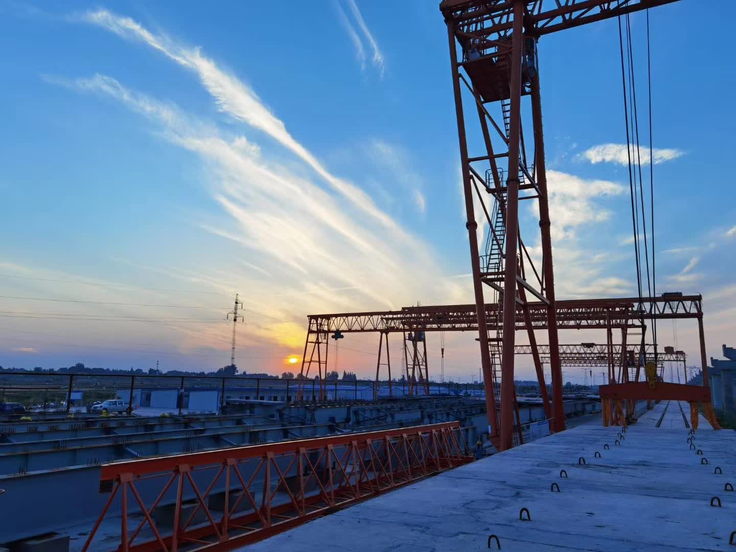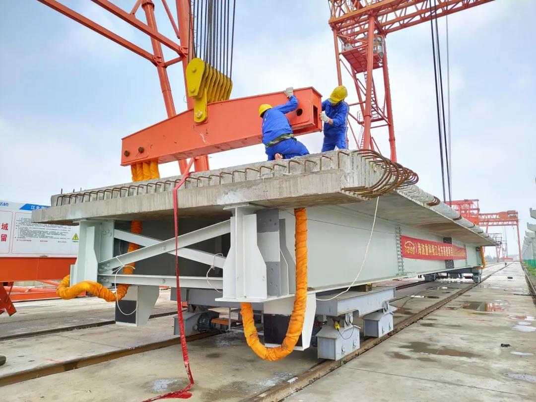 (海波重科新聞報道)2020年5月26日上午9:00,業(yè)主、項目公司副總經理黃遵義、長江路橋江北東高速項目經理王懷才、副經理白朝峰、總工楊建波、PC預制場項目負責人及項目副經理程波、技術部部長歐陽旭、監(jiān)理單位總監(jiān)辦總監(jiān)文輝、副總監(jiān)張貴士、副總監(jiān)趙廷奎、質量部部長鄧再鑫、試驗室主任安紅偉、海波重科總經理劉乾俊、海波重科項目現場負責人閆思為等各位領導、現場作業(yè)人員及媒體記者工作人員共同見證江北東高速項目工業(yè)化橋梁鋼混組合梁首吊的成功。