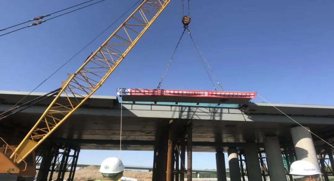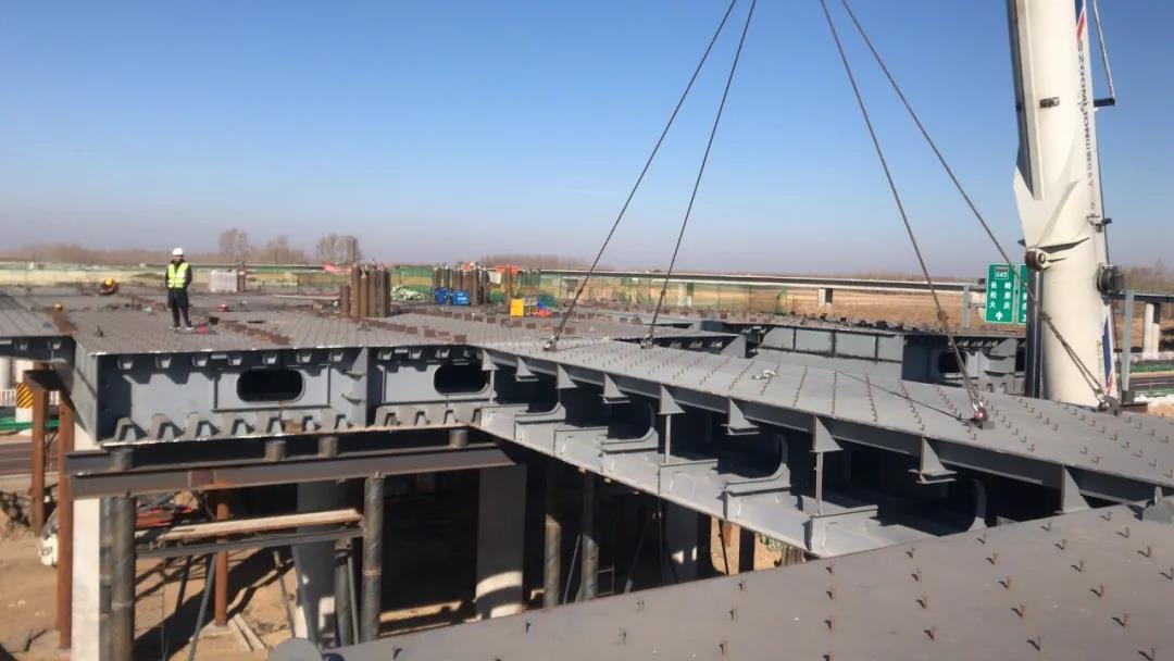 2018年10月,該項目順利完成了鋼箱梁首吊工作,其中敖卜互通均橫跨長深高速,協(xié)力互通XC匝道橫跨大廣高速,施工過程中既需保證高速半幅通車,還需保證過往車輛、施工人員的安全,施工難度極大,同時各聯(lián)段按照既定計劃實施存在較多變數(shù),工期保證難度極大。為保證項目順利完成,在海波重科現(xiàn)場負責(zé)人胡劍濤帶領(lǐng)下,克服種種困難,與甲方密切配合,制定合理的、切實可行的聯(lián)段安裝計劃和可行的交通疏導(dǎo)方案,以保證長深高速、大廣高速車流順暢,同時做好安全防護工作;合理安排梁段安裝順序,選擇最優(yōu)的吊車占位地點,提高安全性、減小安裝難度。